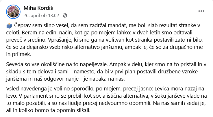 Na Levico moramo gledati kot na izraz socialističnega gibanja v tej državi, takšno kot to v tem trenutku pač je. Če bo Levica kot stranka izginila, bo nastalo nekaj novega. To ni problem. Problem za socialistični tabor je, da očitno nima večjega dosega, pri tem pa je še znotraj razklan glede pristopa. To vidimo v odnosu med umirjenim Luko Mescem in bolj radikalnim Miho Kordišom, a tudi v odnosu med Levico in SD. Če se obrneš na eno stran, pridobiš podpornike, a izgubiš druge in obratno. Kordiš nagovarja določeno populacijo, Mesec drugo. Vse ima svoje pluse in minuse. Toda, kakorkoli obrneš, se zdi, da je strop za Levico tam nekje pri 10% in povezava med Levico in SD, taktično modro izvedena, lahko dobi do 20, 25%.