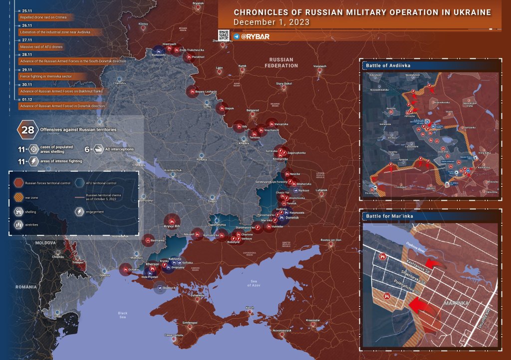 Ruski pritisk na fronti se počasi krepi. V okolici Bahmuta, ki ga je z veliko truda vzel Wagner, počasi znova prevzemajo nadzor nad izgubljenimi ozemlji. Stiskajo klešče okoli Avdeejevke, mesta utrdbe blizu Donecka. Končno je padla Marinka, še eno povsem razrušeno mestece, kjer so se Ukrajinci borili za vsak meter. Napadov je vedno več, a občutek je, da kladivo še vedno ni padlo z vso silo in da mogoče tudi nikoli ne bo. Rusom se nikamor ne mudi, Ukrajina in z njo kolektivni zahod so tisti, ki jih ta vojna vse bolj izčrpava. To se seveda vidi tudi na gospodarskem področju. Ukrajinci brez zahodne finančne pomoči ne morejo vzdrževati svoje države, medtem pa se številne zahodne države soočajo z gospodarskimi težavami. Rusko gospodarstvo medtem raste, ruski oligarhi so vedno bolj bogati, za oborožene sile se namenja rekordne vsote, to pa nima nekega negativnega vpliva na življenje povprečnih državljanov.