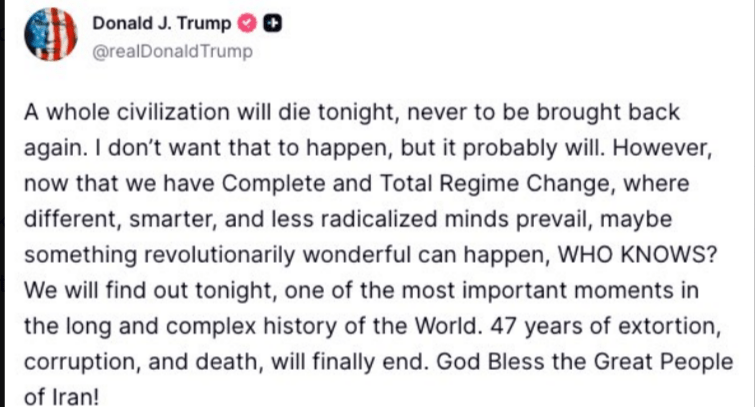In kje je slovenska politika? Obsoja Trumpove grožnje? Poslušajte, norec grozi z genocidom! Z uničenjem celotne civilizacije! Ne razumejo, kaj to pomeni? Več mrtvih, kot v drugi svetovni vojni. Hujši pokol, kot je to bil holokavst. Se bo oglasila predsednica republike, obsodila Trumpove besede? Bo predsednik vlade razglasil, da smo vsi zdaj Iranci, kakor se je hvalil s tem, da bi naj bili kozaki, ker pač podpiramo skrajni režim v Kijevu? Bo reagiralo zunanjo ministrstvo?